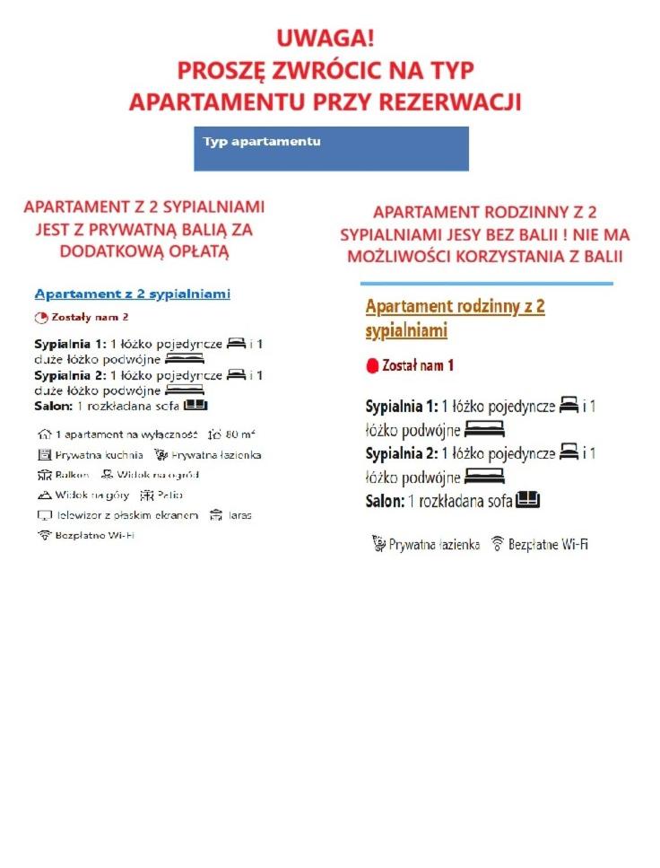 Apartament z 2 sypialniami. This apartments special feature is the hot tub. Featuring a private entrance, this spacious apartment also comprises 1 living room, 2 separate bedrooms and 2 bathrooms with a shower. Guests will find a stovetop, a refrigerator, kitchenware and a microwave in the kitchen. The apartment also provides guests with a barbecue. Boasting a terrace with garden views, this apartment also provides a tea and coffee maker and a flat-screen TV with streaming services. The unit offers 5 beds. Apartament - 8 osobowy. Powierzchnia pokoju ok.: 80 mkw. ;
