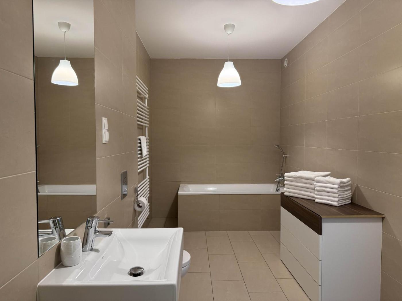 W apartamencie do dyspozycji gości przygotowano balkon, sypialnię (1), salon oraz aneks kuchenny z doskonałym wyposażeniem, w tym zmywarką i piekarnikiem. W apartamencie zapewniono ręczniki i pościel.